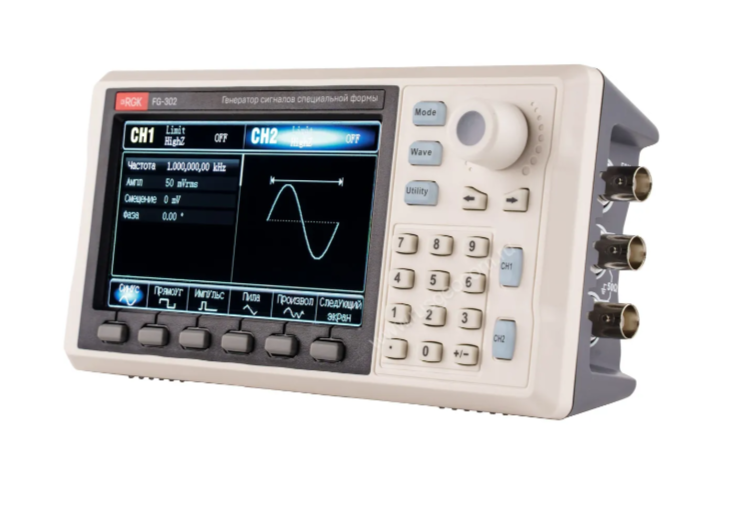 Форма генерируемого сигнала | синусоидальная, прямоугольная, пилообразная, импульсная, шумовой сигнал, постоянный ток, произвольная |