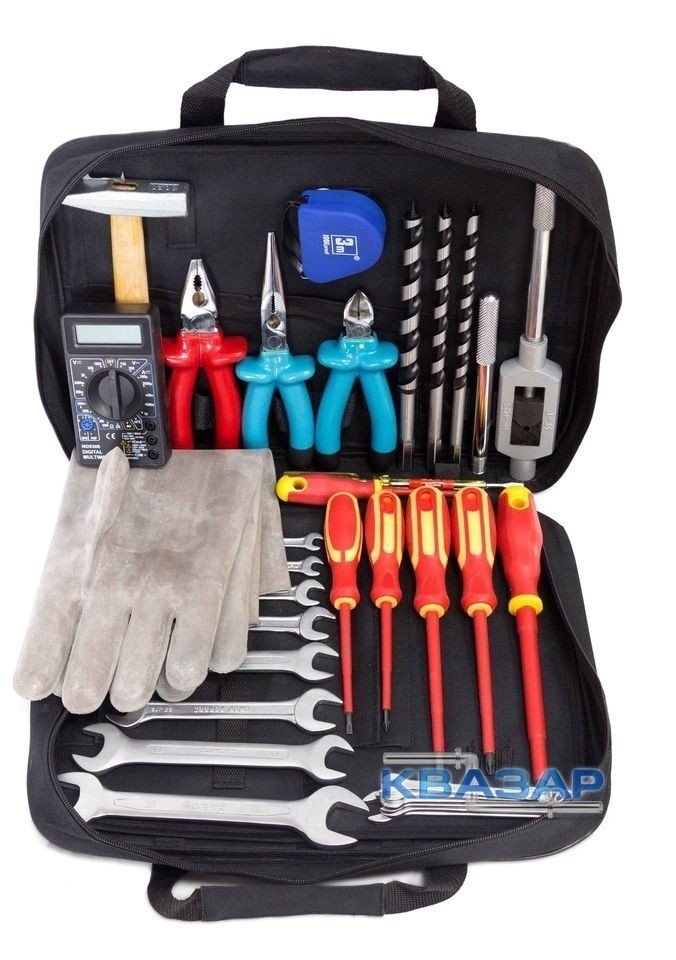 Комплект состоит из 30 видов инструмента: рожковые и комбинированные ключи, изолированные длинногубцы, плоскогубцы и кусачки, сверла по дереву, изолированные отвертки, диэлектрические перчатки и мультиметр.