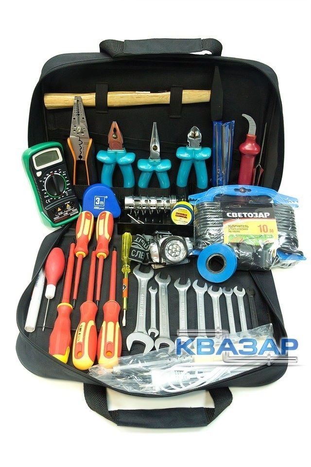 Включает в себя 34 вида инструмента отвертки, плоскогубцы, длинногубцы, нож кабельный — все изолированно до 1000В, ключи гаечные рожковые, электропаяльник, мультиметр, стриппер.