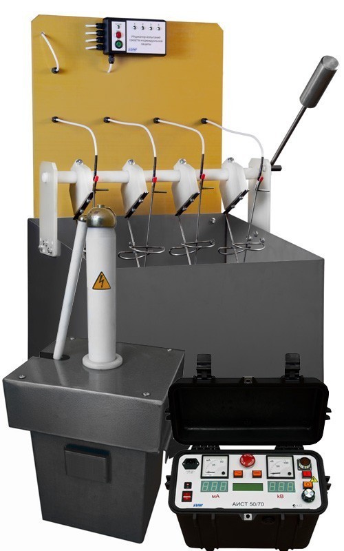 Высоковольтная испытательная установка аппарат для испытания электрооборудования и средств индивидуальной защиты (СИЗ) АИСТ 50/70 СИЗ в комплекте с ванной для испытаний СИЗ предназначена для испытания электрооборудования, электрической прочности изоляции силовых кабельных линий, твердых диэлектриков высоким напряжением переменного тока промышленной частоты до 50 кВ и постоянного тока до 70 кВ и средств индивидуальной защиты. В процессе испытаний измеряется ток утечки на каждом объекте испытаний.